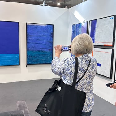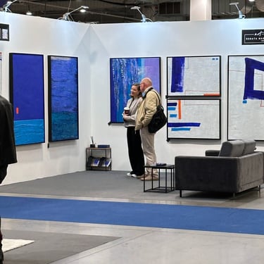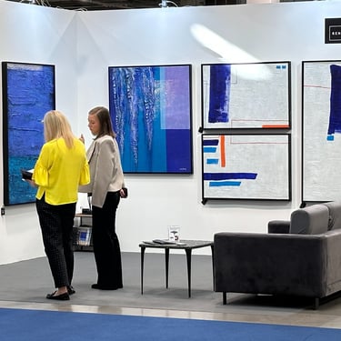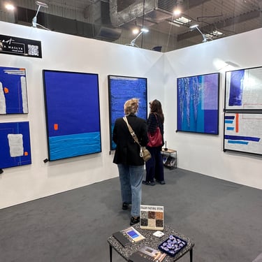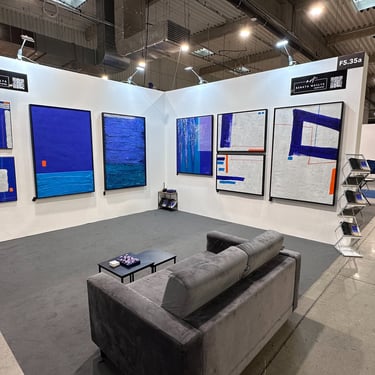 Prezentacja kolekcji niebieskich abstrakcji strukturalnych podczas targów, spotkanie świata sztuki i designu we wspólnej przestrzeni inspiracji